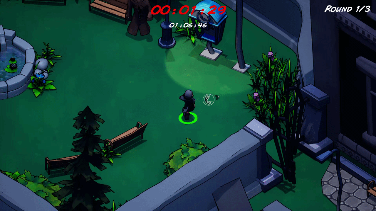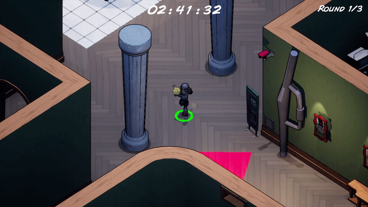 But on the off chance that a player is in the lead they might wish to prematurely end the round to not risk losing the lead. To counter players intentionally trying to skip the rounds over and over again they receive a score reduction every time they trigger the alarm.The score reduction could also be exploited by players, since intentionally shoving their opponents into the security system will worsen their final score.There are always two spots on every level where the player can turn of the alarm, one inside the museum and one outside.